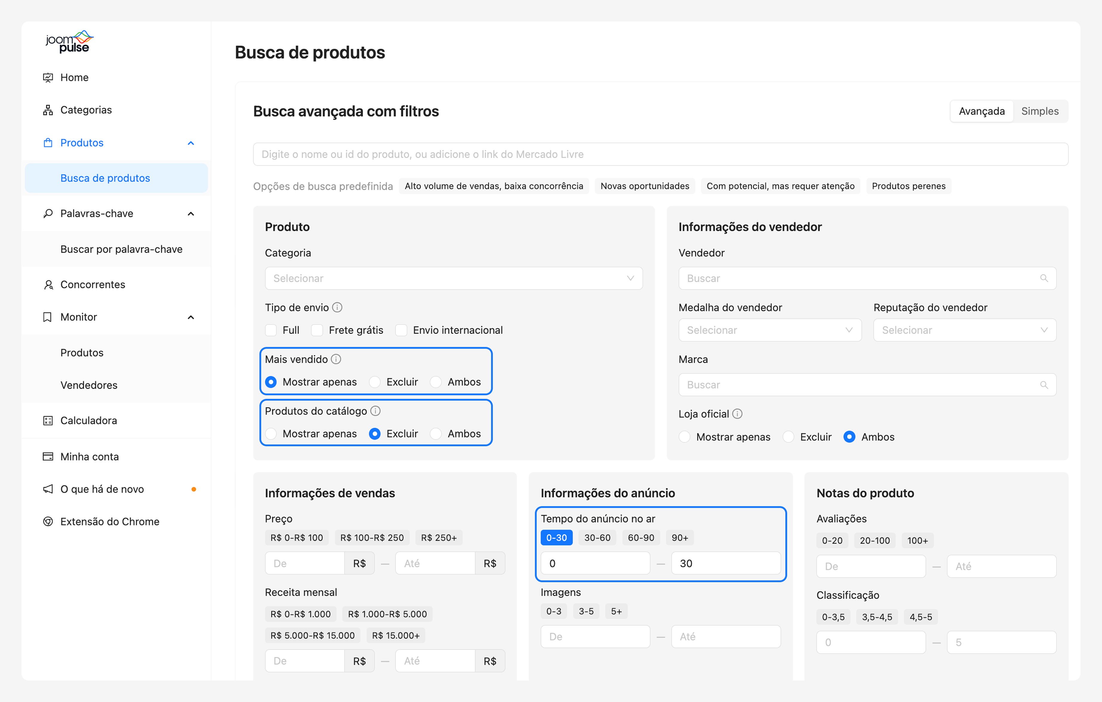 Filtre por faixa de preço, nível de concorrência e muitos outros parâmetros para encontrar suas oportunidades perfeitas