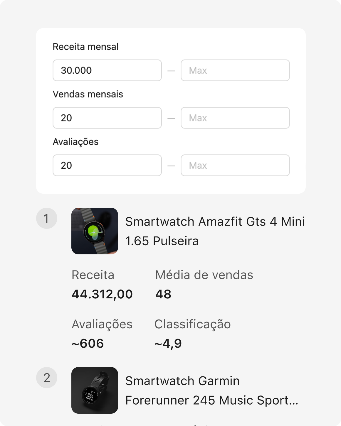 Use o filtro "Excluir Catálogo" para focar em vendedores independentes com produtos de alta demanda e baixa concorrência. Analise tendências de preço e avaliações para confirmar a demanda. Com isso, você encontra: Produtos escondidos (altas vendas, baixa concorrência). Novas marcas em ascensão com potencial de fornecimento, e itens com menos concorrência (margens de lucro maiores).